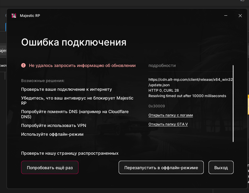 то делать если маджестик не запускается и выдаёт ошибку:не удалось запросить информацию об обновлении